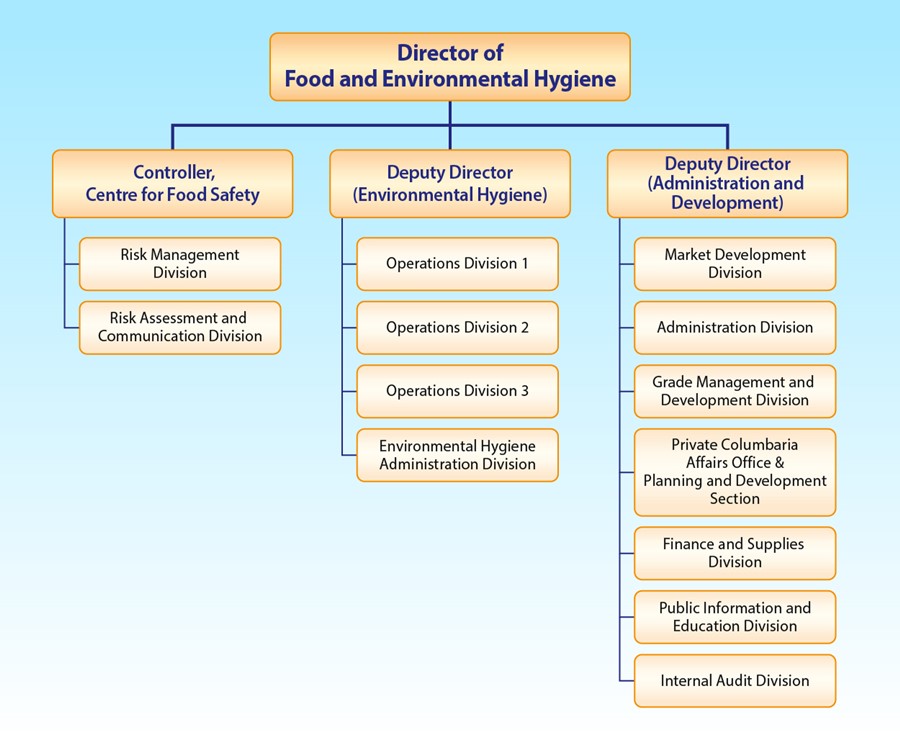 As the head of the Food and Environmental Hygiene Department, the Director of Food and Environmental Hygiene is responsible for planning and directing the operations of the Department with a view to delivering quality service which is responsive to the changing needs and expectation of the community. He is assisted by the Controller, Centre for Food Safety and two Deputy Directors looking after the Centre for Food Safety, the Environmental Hygiene Branch, the Administration & Development Branch respectively.