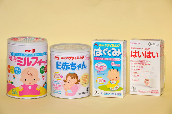 The Centre for Food Safety of the Food and Environmental Hygiene Department today (August 10) called on parents not to let their babies consume four powdered infant formulae imported from Japan as the iodine content of their samples tested were rather low and may have potential adverse health effects on infants. They are (from left) Meiji HP for 0 to 36 months old (850 grams per can), Morinaga for 0 to 12 months old (820 grams per can), Morinaga for 0 to 12 months old (13 grams x 10 packets), and Wakodo for 0 to 9 months old (13 grams x 10 packets).
