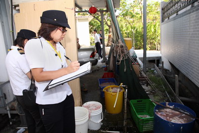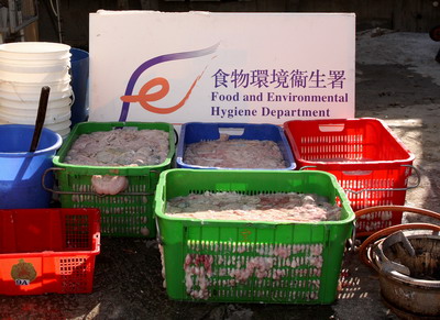 Officers of the Food and Environmental Hygiene Department (FEHD) this (August 14) morning raided an unlicensed food factory in an open-air car park at Ma Tin Tsuen, Yuen Long, and seized about 110 kilogrammes of pig's intestines.