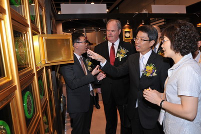 The Director of Food and Environmental Hygiene, Mr Clement Leung, remarks on one of the exhibits, LED niche fronts, during his tour of the Asia Funeral Expo 2011 at the Hong Kong Convention and Exhibition Centre today (May 19). On his right is the President of the National Funeral Directors Association, USA, Mr Patrick Lynch.