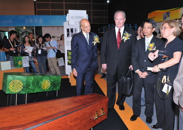 The Director of Food and Environmental Hygiene, Mr Clement Leung, is briefed about coffins made of lightweight structural materials such as sugar cane fibre, waste paper and used cardboard during his tour of the Asia Funeral Expo 2011 at the Hong Kong Convention and Exhibition Centre today (May 19).