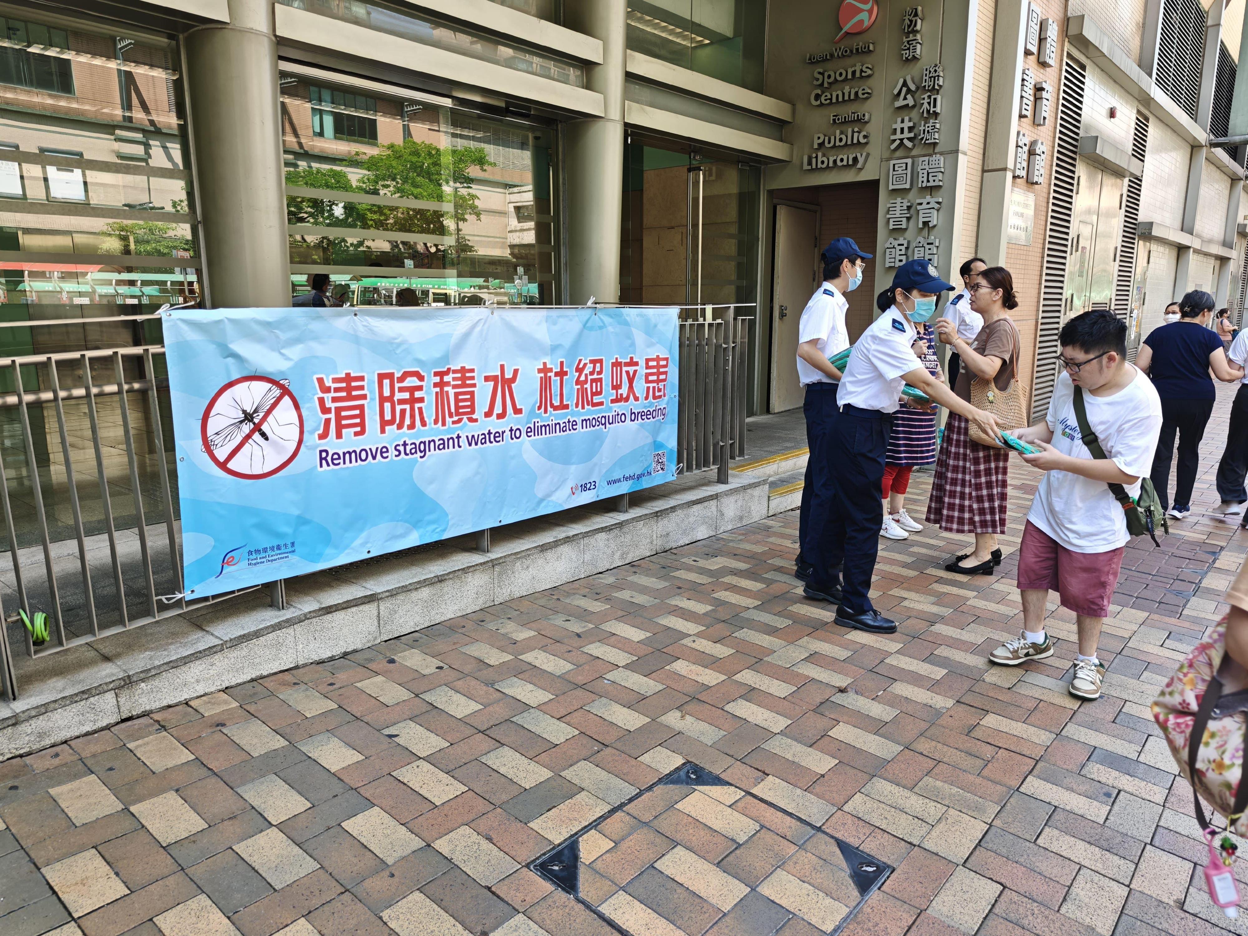 In response to the recent surge in chikungunya fever cases reported in neighbouring regions and some overseas countries, the Food and Environmental Hygiene Department (FEHD) has stepped up mosquito prevention and control efforts through a multi-pronged approach and appeals to members of the public to strengthen anti-mosquito measures. Photo shows FEHD officers distributing leaflets to the public, reminding them to adopt mosquito control measures.