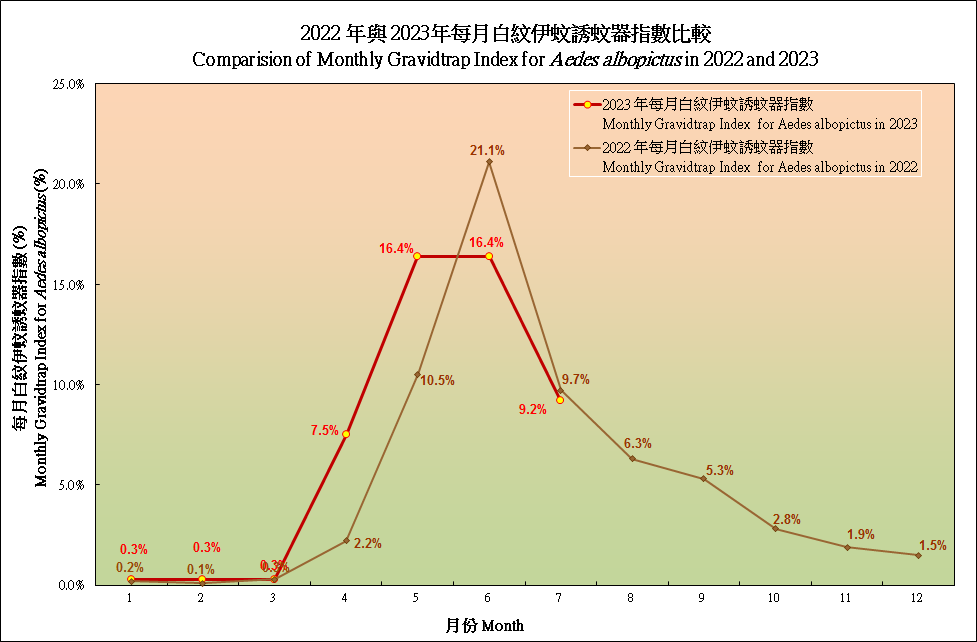 The comparison of Monthly Gravidtrap Index and Monthly Density Index for Aedes albopictus between 2022 and 2023 are shown below.
