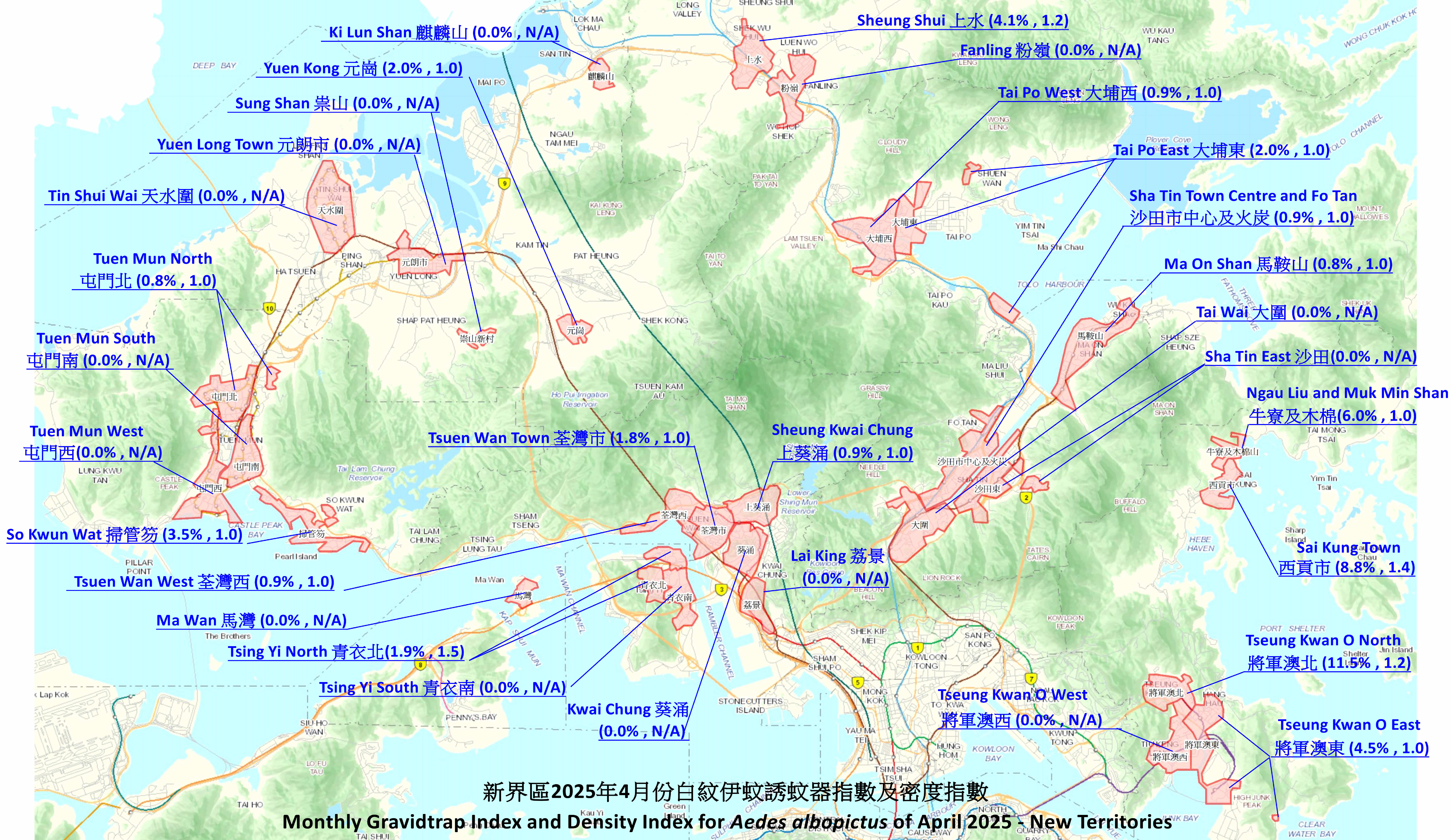 Area Gravidtrap Indices and Density Indices for Aedes albopictus for the 64 survey areas in 2025 are provided below:
