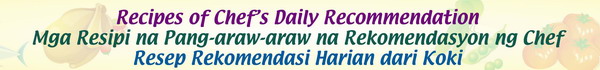 Daily recipes of three dishes and one soup for this week (with Tagalog and Bahasa Indonesia versions)