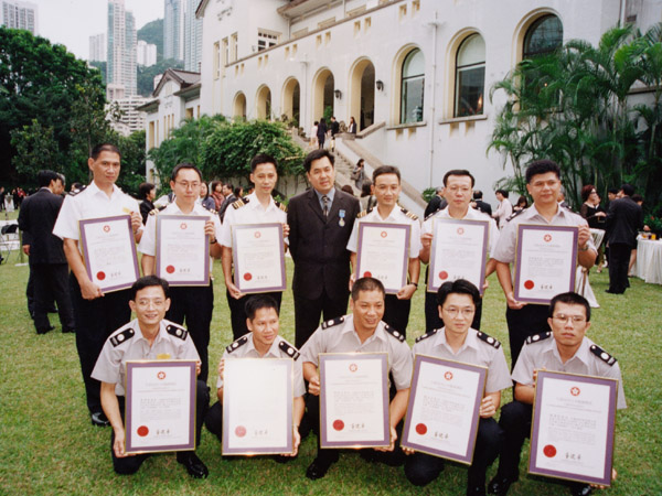 Chief Health Inspector Wong Wai-wan is awarded the Medal of Honour and 11 other officers of the Department including three Health Inspectors and eight Hawker Control Officers are awarded the Chief Executive's Commendations for Government/Public Services at Government House in recognition of their exemplary performance in combating illegal slaughterhouses and unlicensed meat roasting food factories. In addition, a Senior Clerical Officer is also awarded the Chief Executive's Commendations for his distinguished performance in the Hawker Records Office. |