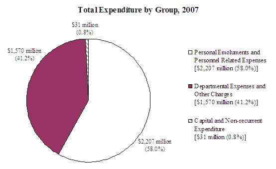 In 2007, the Department spent $3,808 million, including $2,207 million on salaries and allowances and personnel related expenses, $1,570 million on departmental expenses and other charges, and $31 million on capital and non-recurrent expenditure.