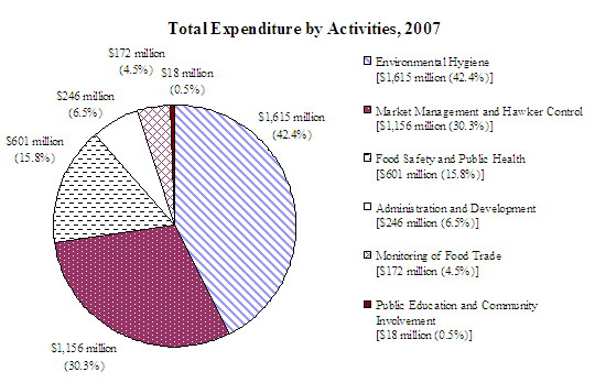 By activities, the majority of the expenditure ($1,615 million) was on environmental hygiene. This was followed by $1,156 million for market management and hawker control, $601 million for food safety and public health, $246 million for administration and development, $172 million for monitoring the food trade, and $18 million for public education and community involvement.