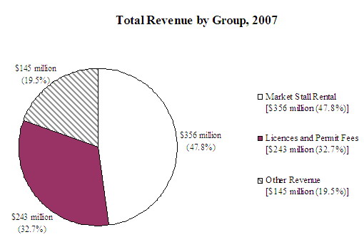 In 2007, the Department received revenue of $744 million. Most of the revenue came from the rental of stalls in public markets managed by the Department ($356 million) and from licence and permit fees ($243 million). Other sources included revenue from cemeteries and crematoria services ($65 million), meat examination ($24 million) and other miscellaneous services ($56 million).