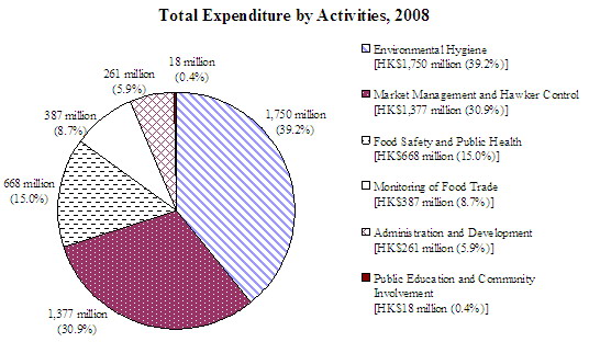 By activities, the majority of the expenditure ($1,750 million) was on environmental hygiene. This was followed by $1,377 million on market management and hawker control, $668 million on food safety and public health, $387 million on monitoring the food trade, $261 million on administration and development, and $18 million on public education and community involvement.