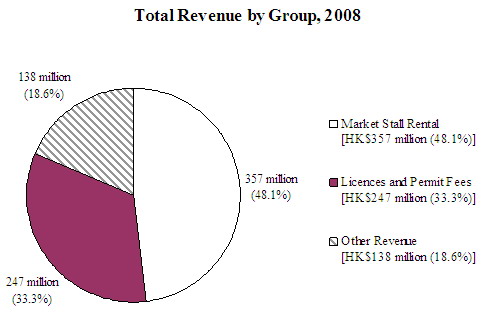 In 2008, the Department received a revenue of $742 million. Most of the revenue came from the rental of stalls in public markets managed by the Department ($357 million) and from licence and permit fees ($247 million). Other sources included revenue from cemeteries and crematoria services ($62 million), meat examination ($21 million) and miscellaneous services ($55 million).