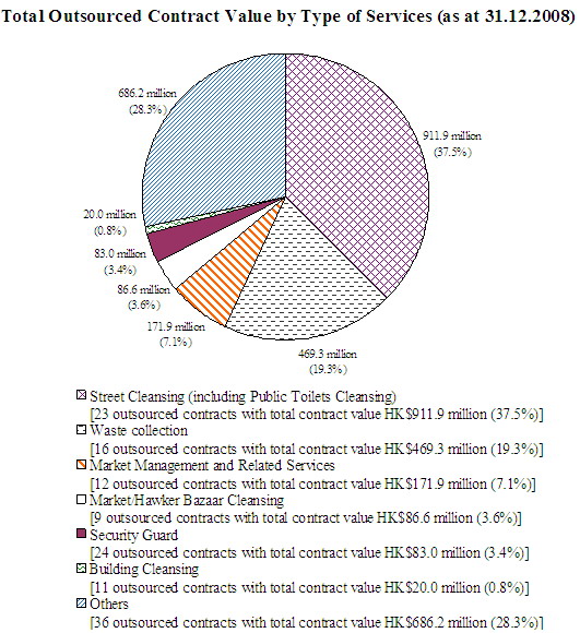 By the end of 2008, 131 contracts valued at $2,428.8 million were in force for the provision of services by private contractors. The outsourcing policy is aimed at greater cost-effectiveness and efficiency in the delivery of services.