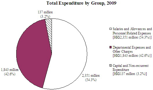 In 2009, the Department spent $4,331 million, including $2,351 million on salaries and allowances and personnel related expenses, $1,843 million on departmental expenses and other charges, and $137 million on capital and non-recurrent expenditure.