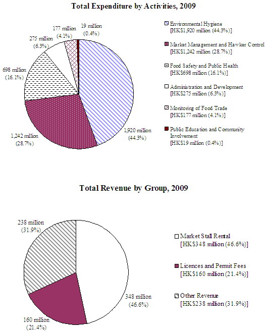 In 2009, the Department received a revenue of $746 million. Most of the revenue came from the rental of stalls in public markets managed by the Department ($348 million) and from licence and permit fees ($160 million). Other sources included revenue from cemeteries and crematoria services ($112 million), meat examination ($22 million) and miscellaneous services ($104 million).