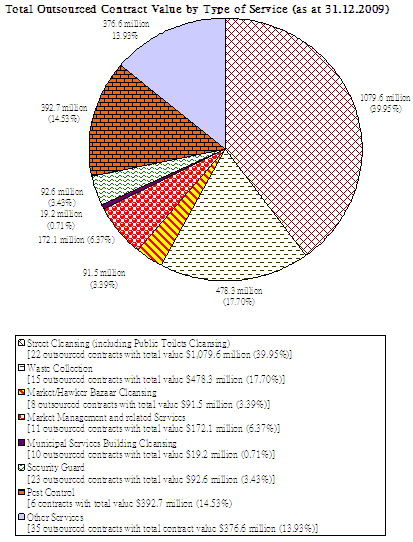 Examples of outsourcing services include: street cleansing, waste collection, mechanical street sweeping, mechanical gully cleansing, collection of recyclables, market/hawker bazaar cleansing, market management and related services, pest control services, municipal services building cleansing, security guard services, animal carcass collection, cleansing and undergrowth cutting services for cemeteries and columbaria, etc.
