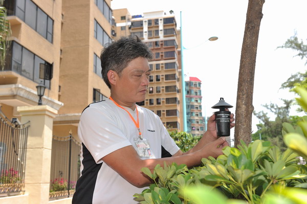 A pest control staff sets up an ovitrap outside a housing estate to monitor the prevalence of Aedes albopictus.