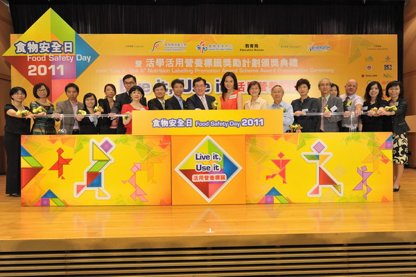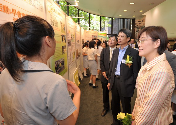 Joined by the Controller of the Centre for Food Safety, Dr Constance Chan (right), the Director of Food and Environmental Hygiene, Mr Clement Leung (second from right), tours a poster exhibition organised by the participating teams of "Live it, Use it" Nutrition Labelling Promotion Award Scheme.