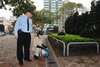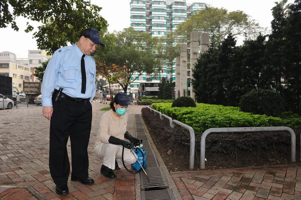 Pest control staff sprays larvicidal oil at roadside gullies to control mosquito breeding.