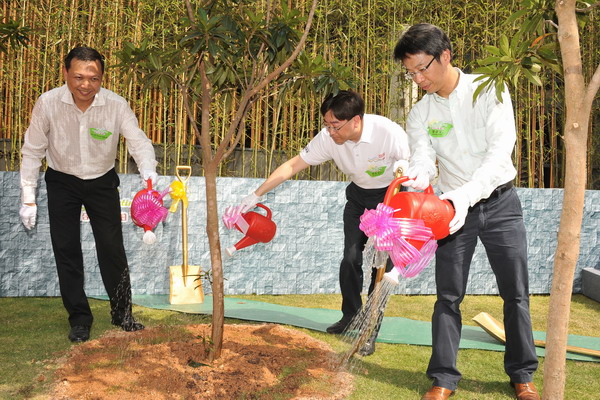 The Secretary for Food and Health, Dr Ko Wing-man (middle); Director of Food and Environmental Hygiene, Mr Clement Leung (right), and an officiating guest water plants at the Wo Hop Shek Tree Planting Day.