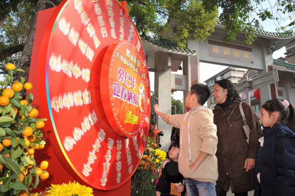 Visitors of Lam Tsuen Lunar New Year Fair in Tai Po spin pinwheel to seek good fortune. |
