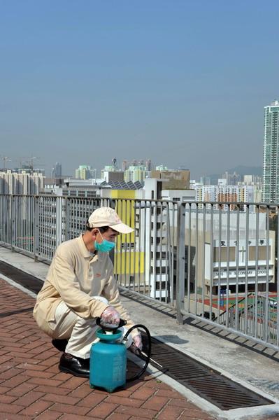 Pest control staff sprays larvicidal oil at gullies to control mosquito breeding. |