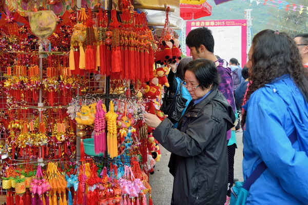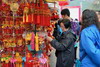 Visitors choosing Lunar New Year decoration items at Che Kung Temple Lunar New Year Fair in Sha Tin.