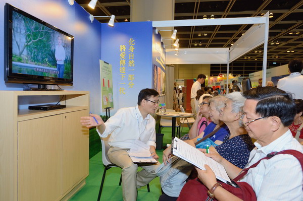 Visitors to the Hong Kong Retiree & Senior Fair 2015 watch videos on green burial at the Department's exhibition booth and are briefed by our staff on FEHD's services. |