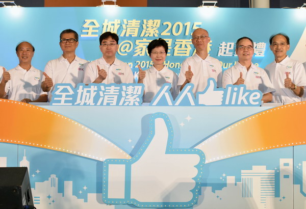The Chief Secretary for Administration, Mrs Carrie Lam (centre) and the Secretary for Food and Health Dr Ko Wing-man (third left) officiate at the kick-off ceremony of "Keep Clean 2015@Hong Kong: Our Home" Campaign.