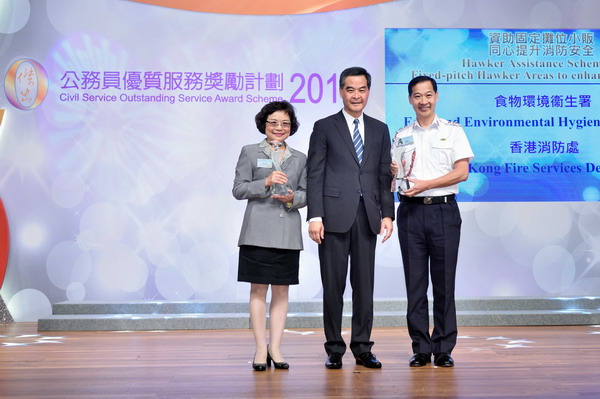 Ms Rhonda Lo (left), Coordinator (Hawker Assistance Scheme), represents the Department to receive from the Chief Executive, Mr C Y Leung (centre), the Gold Prize for the Partnership Award in the Civil Service Outstanding Service Award Scheme 2015. The award winning project displays our strong collaboration with the Fire Services Department in ensuring fire safety in fixed-pitch hawker areas. |