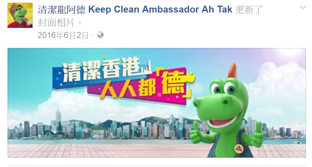 Keep Clean Ambassador Ah Tak Facebook page is launched to promote keeping Hong Kong clean.