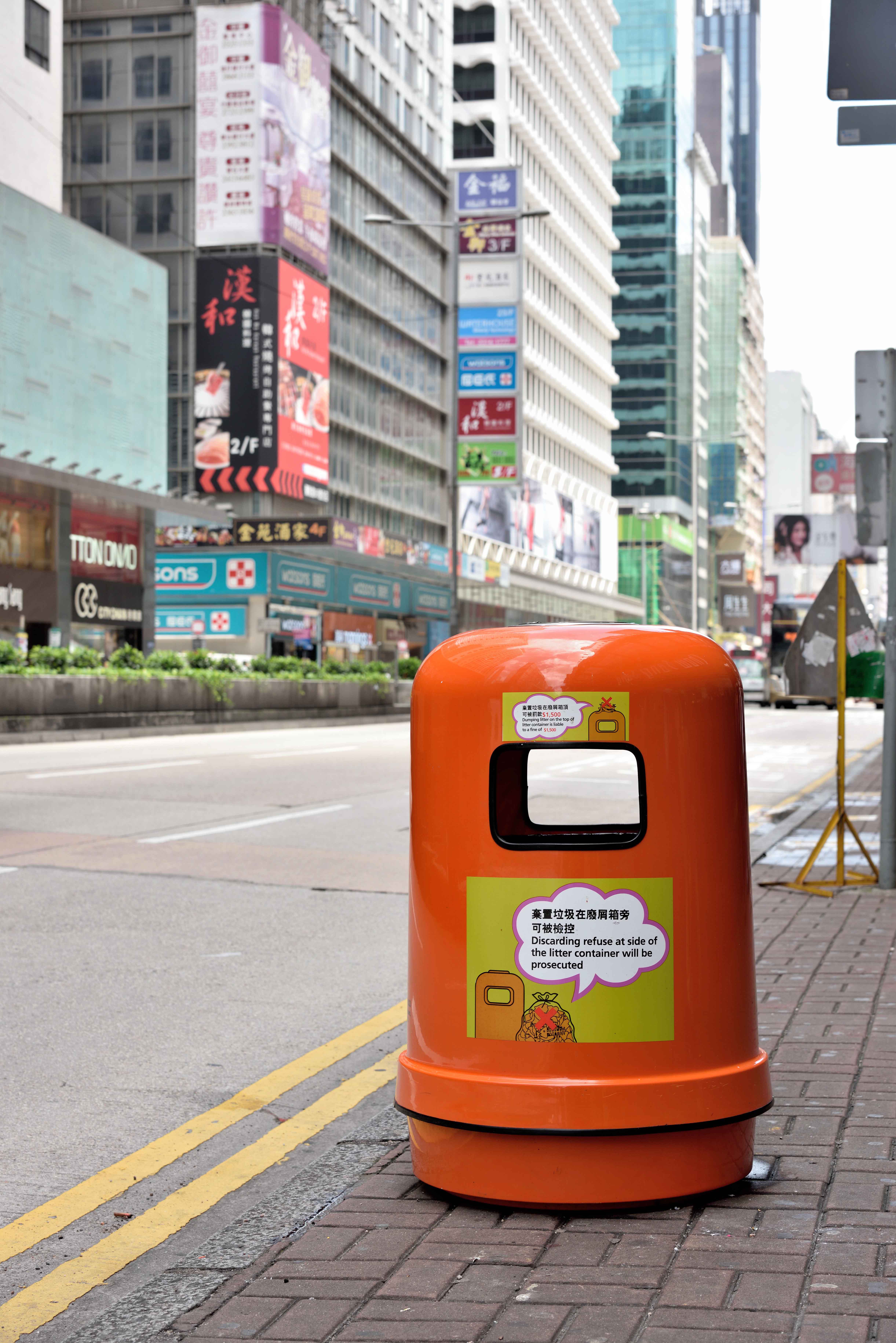 Newly designed litter containers with smaller openings are introduced for trial use.