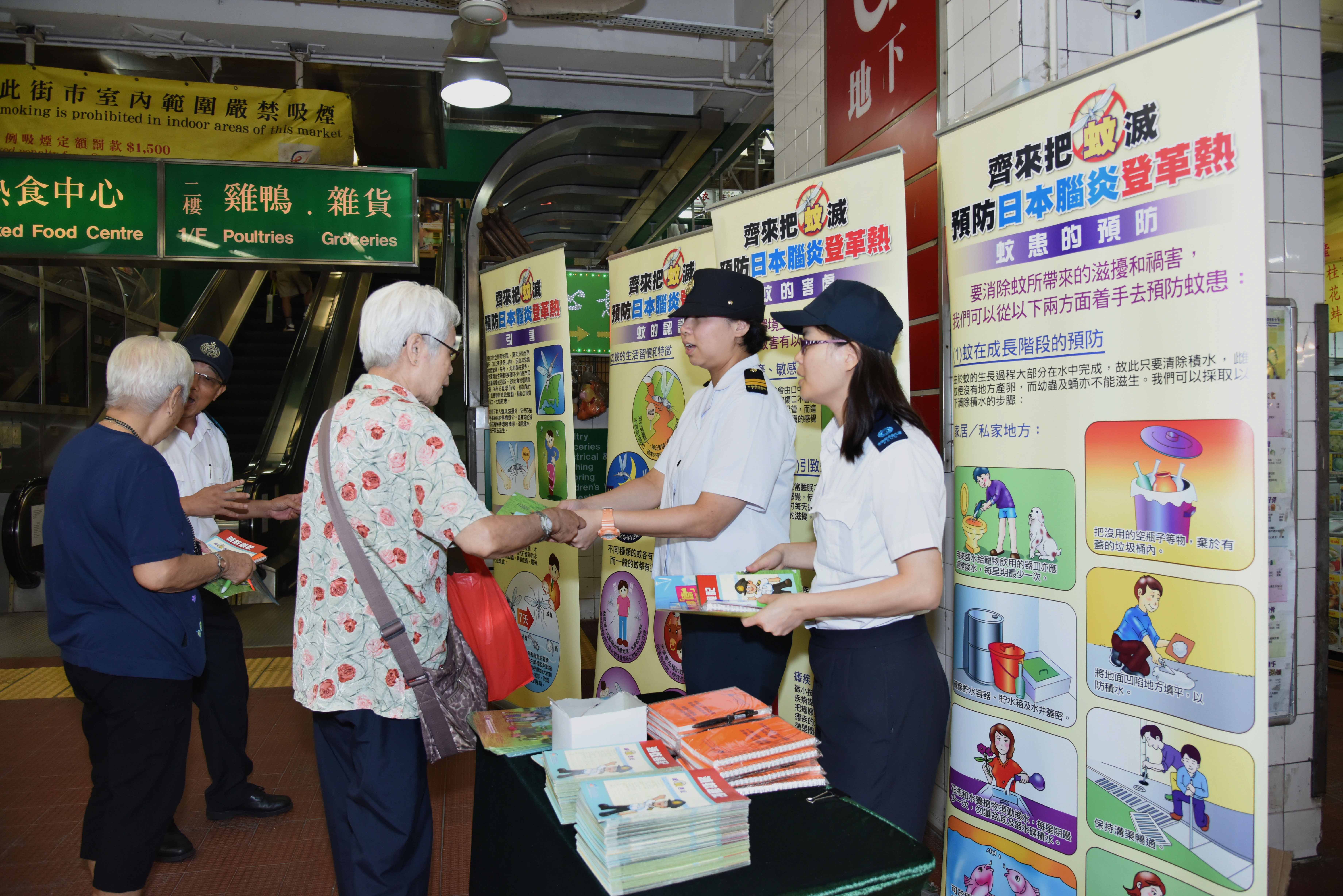 Officers distribute leaflets on mosquito control measures during the third phase of the Anti-mosquito Campaign to arouse public awareness of prevention and control of vector-borne diseases such as dengue fever, Zika virus infection and Japanese encephalitis.
