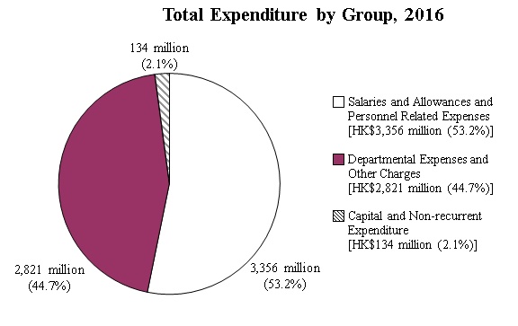In 2016, the Department spent $6,311 million, including $3,356 million on salaries and allowances and personnel related expenses, $2,821 million on departmental expenses and other charges, and $134 million on capital and non-recurrent expenditure.