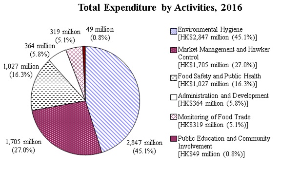 By activities, the majority of the expenditure ($2,847 million) was on environmental hygiene. This was followed by $1,705 million on market management and hawker control, $1,027 million on food safety and public health, $364 million on administration and development, $319 million on monitoring the food trade, and $49 million on public education and community involvement.