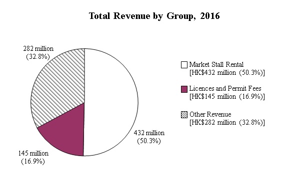 During the year, the Department received a revenue of $859 million. Most of the revenue came from the rental of stalls in public markets managed by the Department ($432 million) and from licence and permit fees ($145 million). Other sources included revenue from cemeteries and crematoria services ($80 million), court fines and statutory penalties ($62 million), slaughterhouse and other concessions ($85 million), meat examination ($20 million) and miscellaneous services ($35 million).