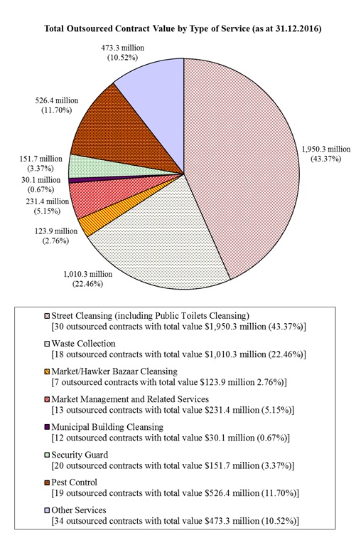 Examples of outsourcing services include: street cleansing, waste collection, mechanical street sweeping, mechanical gully cleansing, collection of recyclables, market management, cleansing, pest control and related services, rodent, mosquito and other pest control services, municipal services building cleansing, security guard services, animal carcass collection, cleansing and horticultural maintenance services for cemeteries and columbaria, tree risk assessment and arboricultural services, etc.