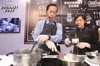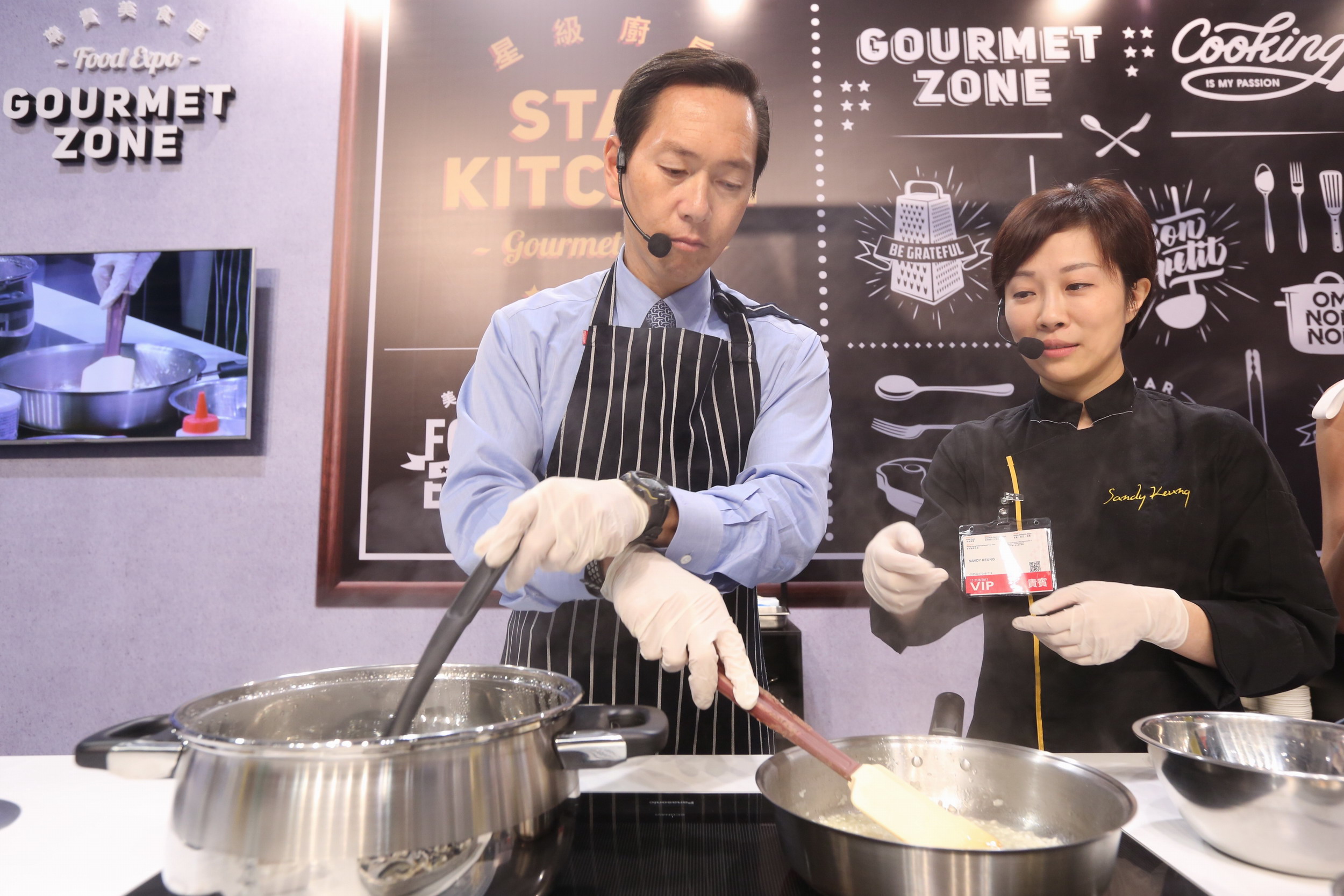 The Chairperson of the Committee on Reduction of Salt and Sugar in Food, Mr Bernard Chan (left), and the renowned chef, Sandy Keung, show to cook reduced-salt-and-sugar cuisine at the "Star Chef Cooking Demonstration" session of the Food Expo.