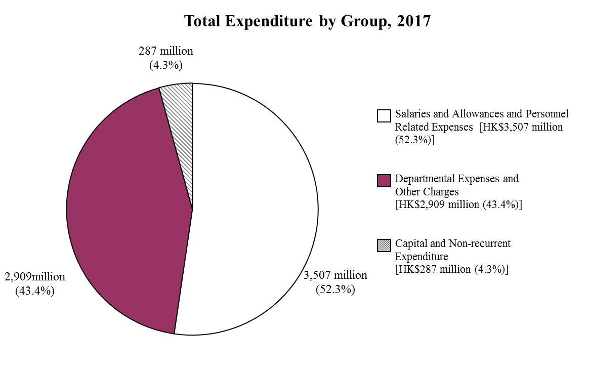 In 2017, the Department spent $6,703 million, including $3,507 million on salaries and allowances and personnel related expenses, $2,909 million on departmental expenses and other charges, and $287 million on capital and non-recurrent expenditure.