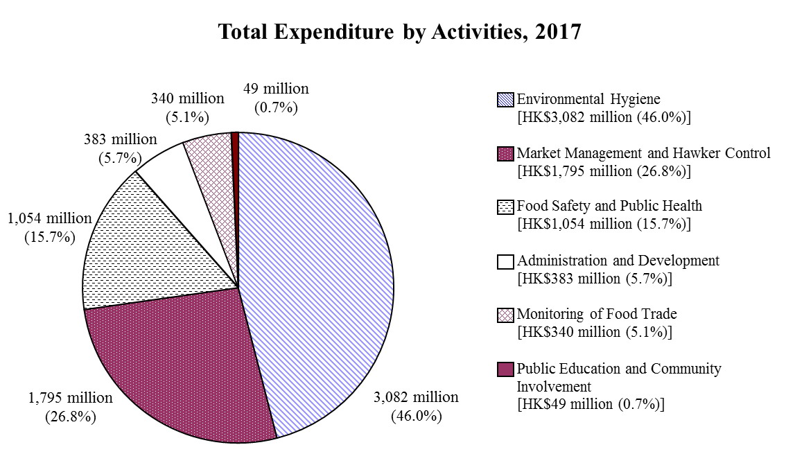 By activities, the majority of the expenditure ($3,082 million) was on environmental hygiene. This was followed by $1,795 million on market management and hawker control, $1,054 million on food safety and public health, $383 million on administration and development, $340 million on monitoring the food trade, and $49 million on public education and community involvement.