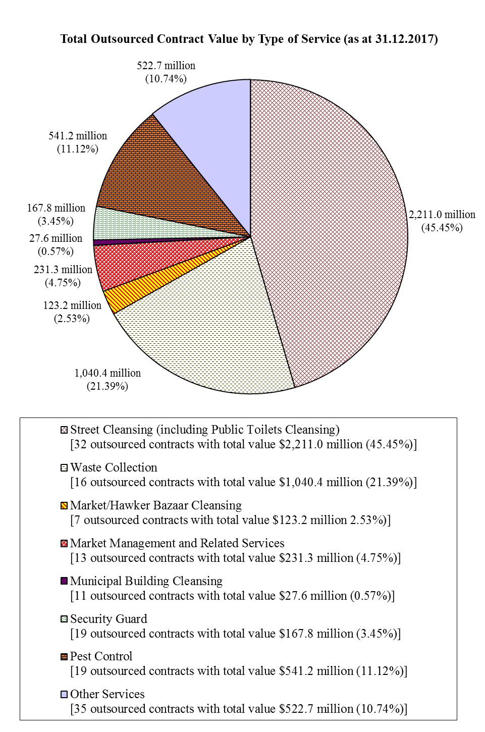 Examples of outsourcing services include: street cleansing, waste collection, mechanical street sweeping, mechanical gully cleansing, collection of recyclables, market management, cleansing, pest control and related services, rodent, mosquito and other pest control services, municipal services building cleansing, security guard services, animal carcass collection, cleansing and horticultural maintenance services for cemeteries and columbaria, tree risk assessment and arboricultural services, etc.