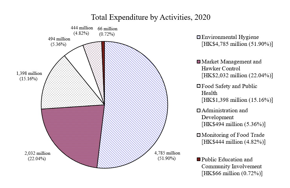By activities, the majority of the expenditure ($4,785 million) was on environmental hygiene. This was followed by $2,032 million on market management and hawker control, $1,398 million on food safety and public health, $494 million on administration and development, $444 million on monitoring the food trade, and $66 million on public education and community involvement.