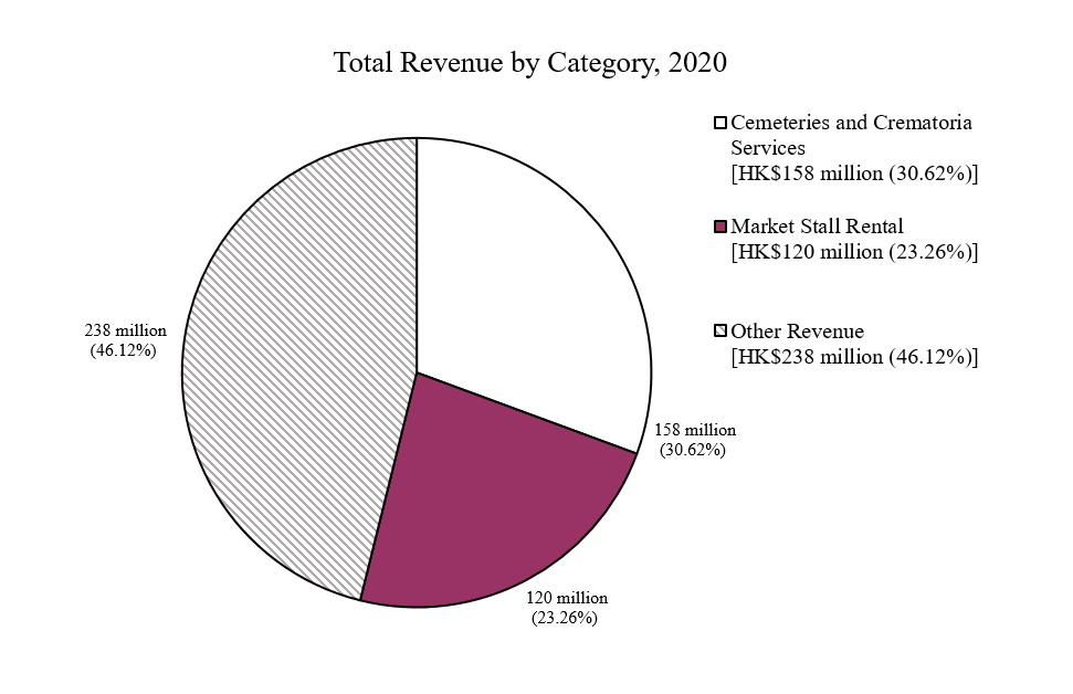 During the year, the Department received a revenue of $516 million. Most of the revenue came from cemeteries and crematoria services ($158 million) and the rental of stalls in public markets managed by the Department ($120 million). Other sources included revenue from court fines and statutory penalties ($88 million), recovery of losses ($74 million), slaughterhouse and other concessions ($29 million), licence and permit fees ($27 million) and miscellaneous services ($20 million).