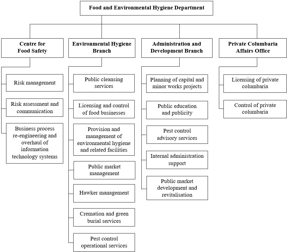 We deliver our services through the Centre for Food Safety, the Environmental Hygiene Branch, the Administration and Development Branch and the Private Columbaria Affairs Office (organisation chart as below). The following paragraphs give an overview of our major operations, some of which may have an impact on the environment.