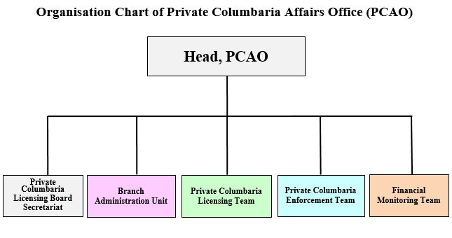 The Food and Environmental Hygiene Department has set up a “Private Columbaria Affairs Office” (PCAO) to handle matters relating to the implementation of the Private Columbaria Ordinance and provide executive support to the Private Columbaria Licensing Board. The PCAO comprises the Licensing Board Secretariat, the Branch Administration Unit, the Licensing Team, the Enforcement Team and the Financial Monitoring Team.