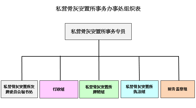 食物环境卫生署已成立私营骨灰安置所事务办事处(骨灰所办),骨灰所办的工作是处理实施《私营骨灰安置所条例》的相关事宜和为私营骨灰安置所发牌委员会提供行政支持。骨灰所办设有发牌委员会秘书处、行政组、牌照组、执法组和财务监察组。