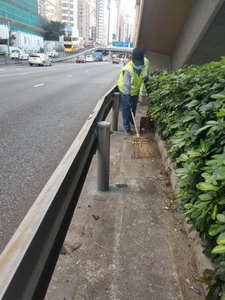 在清扫方面,就路旁花圃及行车路中央分隔绿化带的弃置垃圾,食环署会定期进行巡查及督促承办商清理路边花床上的杂物及垃圾,亦会因应实际情况安排特别清扫行动,以保持环境卫生。食环署现设有约30队中央分隔带队及10队机动扫街车队,在其负责范畴的公共道路清扫公路、天桥及道路分隔栏,并清理于中央分隔带和路旁的垃圾。一般清洁频次由每日一次到每两月一次不等,并会按实际情况需要调整清洁频次。除了清理马路中线花槽外,如发现有植物过度茂盛影响道路使用者,食环署会通知康乐文化事务署或路政署跟进。