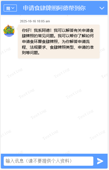 此聊天机械人为全自动化程式,能即时回应用户查询,提供基本参考资料。惟由于系统仍在持续学习与优化中,其回应内容未必完全准确或涵盖所有情况。如有进一步查询,建议直接联络食环署各牌照办事处或食肆牌照资源中心以获取准确资讯。