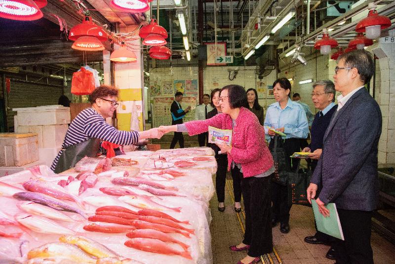 食物环境卫生署(食环署)现正在全港各区进行岁晚清洁大行动。行动期间,食环署加强公众街市的巡查次数及清洁。食物及卫生局局长陈肇始教授(左二)今日(一月十五日)到东区渣华道街市视察有关的清洁工作。图示陈肇始教授呼籲档主支持有关行动。