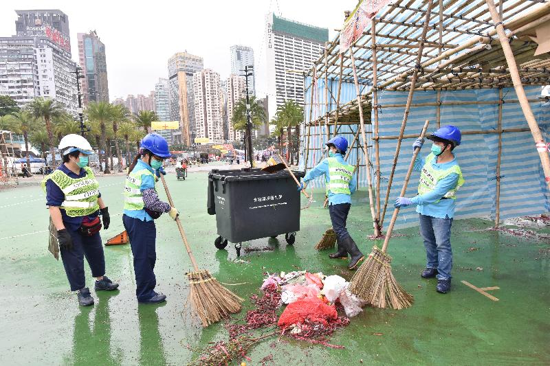 食物环境卫生署人员今日(一月二十五日)清早在年宵市场结束后开始清理场地。图示清洁工人在维多利亚公园年宵市场结束后清理场地。