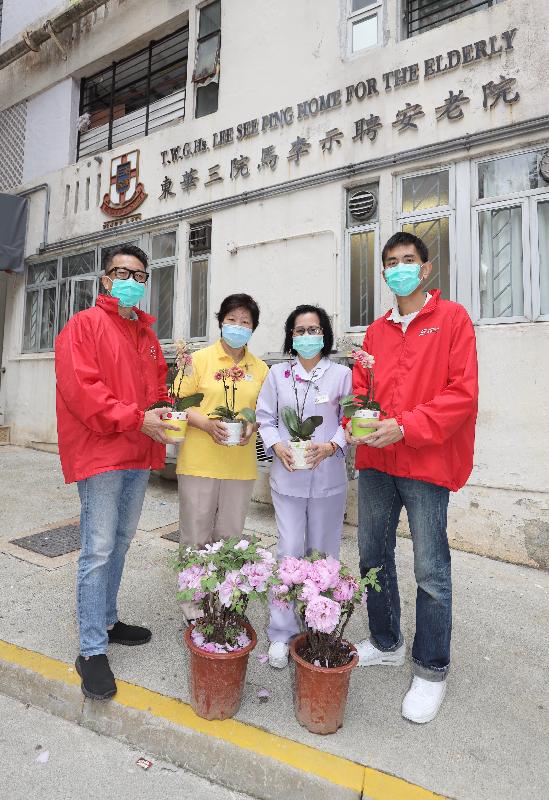食物环境卫生署员工组成义工队,今日(一月二十五日)将年宵市场花档档主捐赠的未售出花卉及盆栽运送给安老院、儿童院舍、残疾人士院舍及公立医院。图示义工队成员将年花转送予一所安老院的代表。